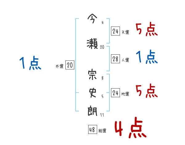 人運![]() | 今瀬宗史朗さんの人運は28画の1つ星!家庭環境に注意。スポーツで活躍できる能力があるかも。 性格や才能などを表す2番目に重要な運勢です。人間関係や協調性、社会的な成功に影響します。主に20歳から50歳ぐらいまでの中年期の運勢を表します。 |