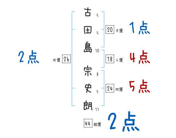外運![]() | 古田島宗史朗さんの外運は26画の2つ星!波瀾万丈かも。信頼できる人を大事にしましょう。 生活面を象徴する運勢です。外部から受ける影響力を表し、結婚運、家庭運や職場、環境への順応性を表します。 |