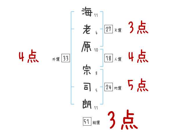 外運![]() | 海老原宗司朗さんの外運は33画の4つ星!権力志向でプライドが高い。勇気があり運を切り開き成功する。 生活面を象徴する運勢です。外部から受ける影響力を表し、結婚運、家庭運や職場、環境への順応性を表します。 |