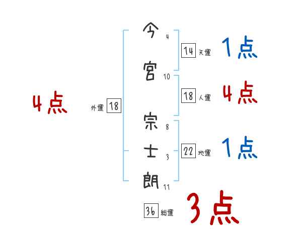 今宮宗士朗さんの画数の鑑定結果
