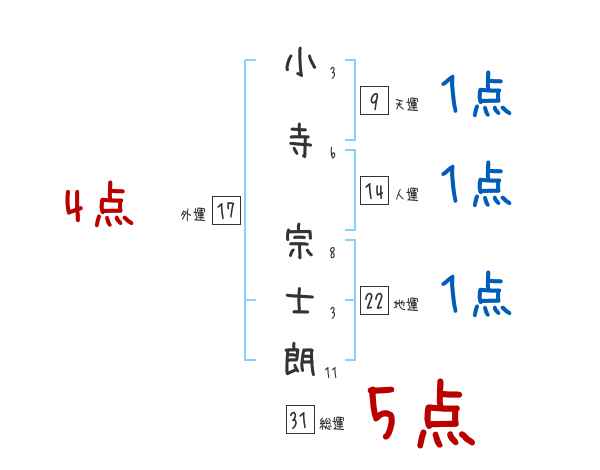 外運![]() | 小寺宗士朗さんの外運は17画の4つ星!積極的な行動力。地位を気づき財産を手に入れる。純粋な心と直感力。 生活面を象徴する運勢です。外部から受ける影響力を表し、結婚運、家庭運や職場、環境への順応性を表します。 |