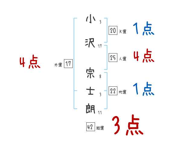総運![]() | 小沢宗士朗さんの総運は42画の3つ星!病気に注意。多芸であるが消極的でおとなしい。 あなたの人生を表す1番重要な運勢です。生涯を通じて影響する総合運となり、主に50歳以降の晩年期に影響を及ぼします。 |