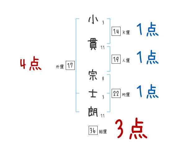 外運![]() | 小貫宗士朗さんの外運は17画の4つ星!積極的な行動力。地位を気づき財産を手に入れる。純粋な心と直感力。 生活面を象徴する運勢です。外部から受ける影響力を表し、結婚運、家庭運や職場、環境への順応性を表します。 |