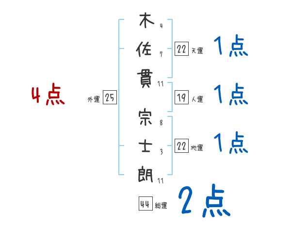 総運![]() | 木佐貫宗士朗さんの総運は44画の2つ星!誠実で慎重な性格。物事を考えすぎないように注意しましょう。 あなたの人生を表す1番重要な運勢です。生涯を通じて影響する総合運となり、主に50歳以降の晩年期に影響を及ぼします。 |