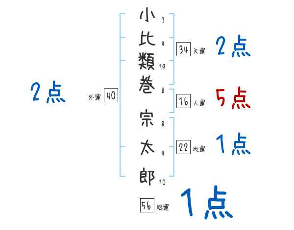 人運![]() | 小比類巻宗太郎さんの人運は16画の5つ星!人望が厚く大きく発展する。逆転成功が見える。 性格や才能などを表す2番目に重要な運勢です。人間関係や協調性、社会的な成功に影響します。主に20歳から50歳ぐらいまでの中年期の運勢を表します。 |