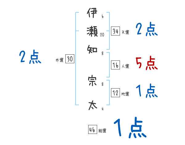 総運![]() | 伊瀬知宗太さんの総運は46画の1つ星!迷走することが多く苦労するかも。目先のことにとらわれないように。 あなたの人生を表す1番重要な運勢です。生涯を通じて影響する総合運となり、主に50歳以降の晩年期に影響を及ぼします。 |