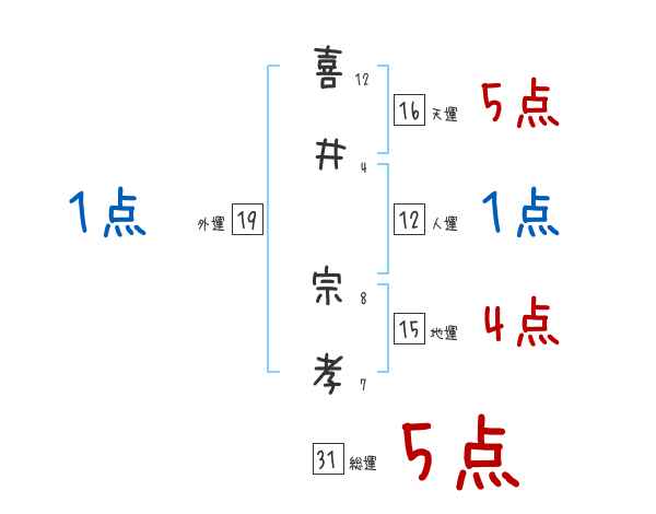 地運![]() | 喜井宗孝さんの地運は15画の4つ星!人徳があり出世する。順調に物事を進め円満な人生。 個性を表す基礎的な運勢です。性格形成や対人関係、行動力など家庭環境に影響されます。主に誕生してから20歳くらいまでの若年期の運勢を表します。 |