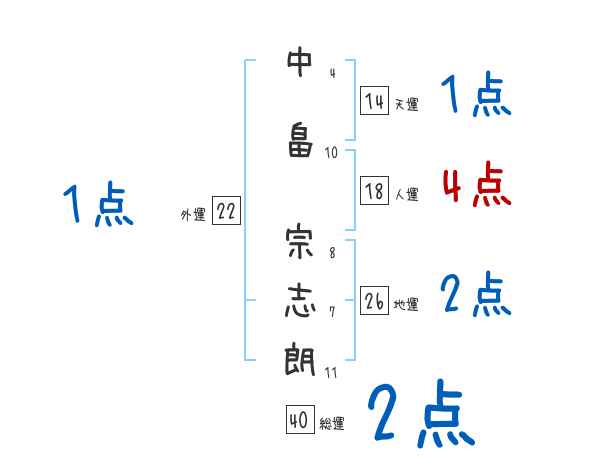 総運![]() | 中畠宗志朗さんの総運は40画の2つ星!自信過剰で物事に固執するためトラブルに注意。 あなたの人生を表す1番重要な運勢です。生涯を通じて影響する総合運となり、主に50歳以降の晩年期に影響を及ぼします。 |