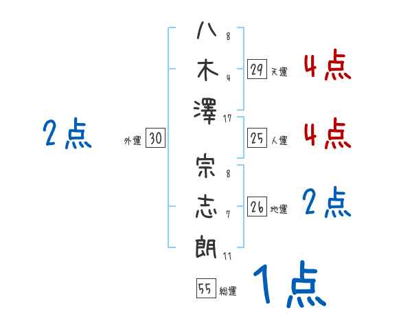 天運![]() | 八木澤宗志朗さんの天運は29画の4つ星!完全主義で才能がある。厳格な心の持ち主。 家系が持つ宿命的な運勢を表します。祖先から受け継いだ苗字ですので自分の力が及びません。家柄を象徴します。 |