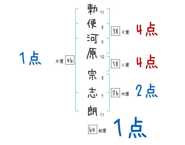 天運![]() | 勅使河原宗志朗さんの天運は38画の4つ星!温厚な性格で技術的な才能を発揮する。職人的な仕事に向いている。 家系が持つ宿命的な運勢を表します。祖先から受け継いだ苗字ですので自分の力が及びません。家柄を象徴します。 |