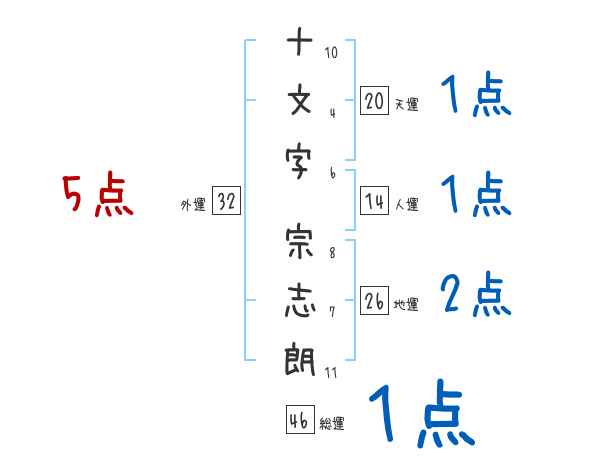 外運![]() | 十文字宗志朗さんの外運は32画の5つ星!柔軟性があり成功する。チャンスが多く金運が良い。 生活面を象徴する運勢です。外部から受ける影響力を表し、結婚運、家庭運や職場、環境への順応性を表します。 |