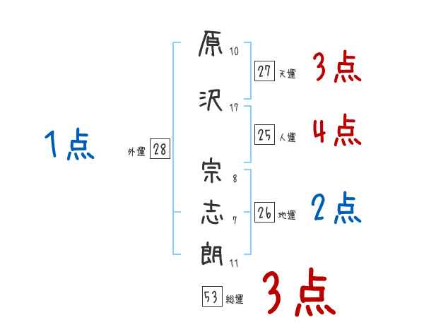 総運![]() | 原沢宗志朗さんの総運は53画の3つ星!やや見栄っ張りで虚栄心がある。散財に注意。 あなたの人生を表す1番重要な運勢です。生涯を通じて影響する総合運となり、主に50歳以降の晩年期に影響を及ぼします。 |
