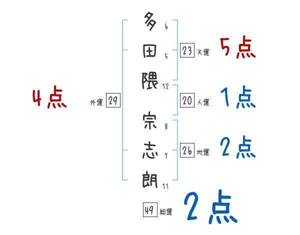 外運![]() | 多田隈宗志朗さんの外運は29画の4つ星!完全主義で才能がある。厳格な心の持ち主。 生活面を象徴する運勢です。外部から受ける影響力を表し、結婚運、家庭運や職場、環境への順応性を表します。 |