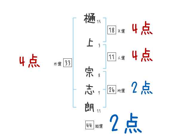 外運![]() | 樋上宗志朗さんの外運は33画の4つ星!権力志向でプライドが高い。勇気があり運を切り開き成功する。 生活面を象徴する運勢です。外部から受ける影響力を表し、結婚運、家庭運や職場、環境への順応性を表します。 |