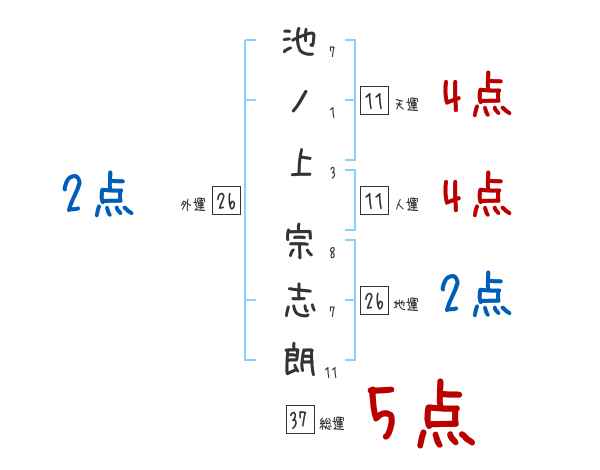 天運![]() | 池ノ上宗志朗さんの天運は11画の4つ星!着実に富や地位を得る幸運な人生。 家系が持つ宿命的な運勢を表します。祖先から受け継いだ苗字ですので自分の力が及びません。家柄を象徴します。 |
