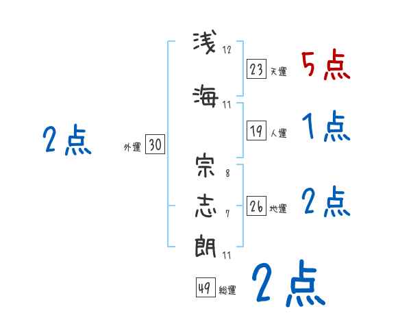 天運![]() | 浅海宗志朗さんの天運は23画の5つ星!想像力に優れ活力がある。一代で成功し名誉を手に入れる。 家系が持つ宿命的な運勢を表します。祖先から受け継いだ苗字ですので自分の力が及びません。家柄を象徴します。 |