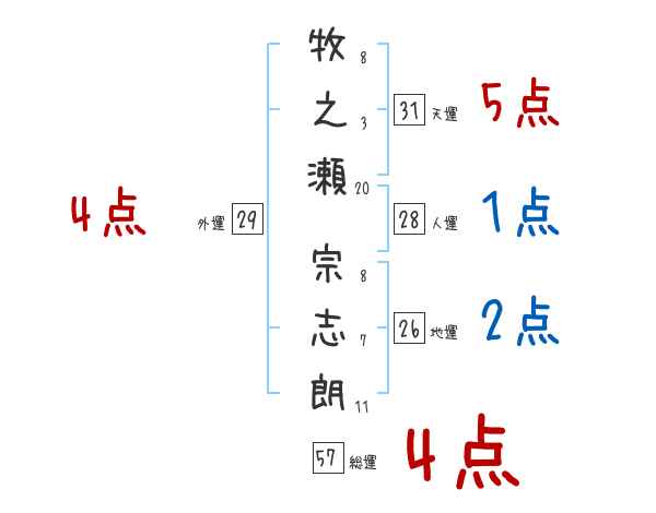 外運![]() | 牧之瀬宗志朗さんの外運は29画の4つ星!完全主義で才能がある。厳格な心の持ち主。 生活面を象徴する運勢です。外部から受ける影響力を表し、結婚運、家庭運や職場、環境への順応性を表します。 |