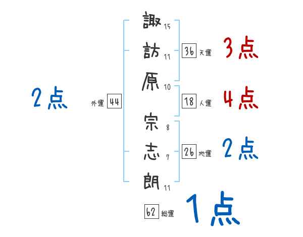 天運![]() | 諏訪原宗志朗さんの天運は36画の3つ星!先見性が豊かです。多少神経質で苦労することも。 家系が持つ宿命的な運勢を表します。祖先から受け継いだ苗字ですので自分の力が及びません。家柄を象徴します。 |