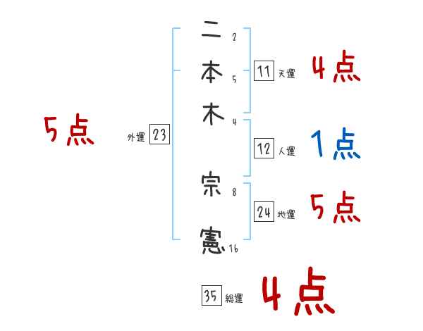 外運![]() | 二本木宗憲さんの外運は23画の5つ星!想像力に優れ活力がある。一代で成功し名誉を手に入れる。 生活面を象徴する運勢です。外部から受ける影響力を表し、結婚運、家庭運や職場、環境への順応性を表します。 |