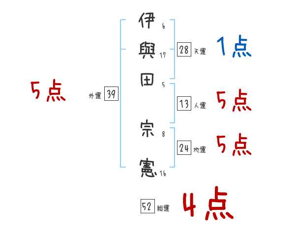 外運![]() | 伊與田宗憲さんの外運は39画の5つ星!社交性に優れ人望が厚い。人の上に立ち成功する。 生活面を象徴する運勢です。外部から受ける影響力を表し、結婚運、家庭運や職場、環境への順応性を表します。 |