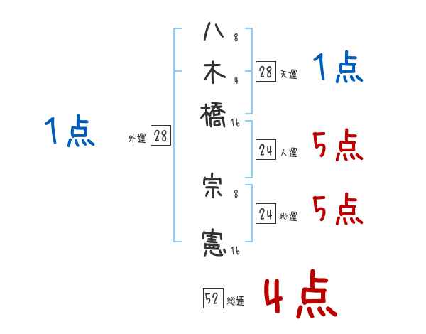 天運![]() | 八木橋宗憲さんの天運は28画の1つ星!家庭環境に注意。スポーツで活躍できる能力があるかも。 家系が持つ宿命的な運勢を表します。祖先から受け継いだ苗字ですので自分の力が及びません。家柄を象徴します。 |