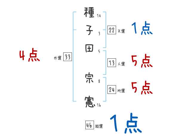 外運![]() | 種子田宗憲さんの外運は33画の4つ星!権力志向でプライドが高い。勇気があり運を切り開き成功する。 生活面を象徴する運勢です。外部から受ける影響力を表し、結婚運、家庭運や職場、環境への順応性を表します。 |