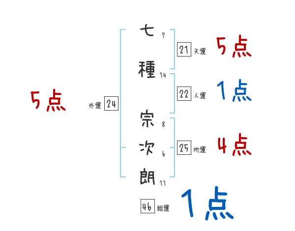 天運![]() | 七種宗次朗さんの天運は21画の5つ星!統率力がある。独立し成功する。名誉を手に入れる。 家系が持つ宿命的な運勢を表します。祖先から受け継いだ苗字ですので自分の力が及びません。家柄を象徴します。 |