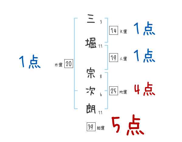 総運![]() | 三堀宗次朗さんの総運は39画の5つ星!社交性に優れ人望が厚い。人の上に立ち成功する。 あなたの人生を表す1番重要な運勢です。生涯を通じて影響する総合運となり、主に50歳以降の晩年期に影響を及ぼします。 |