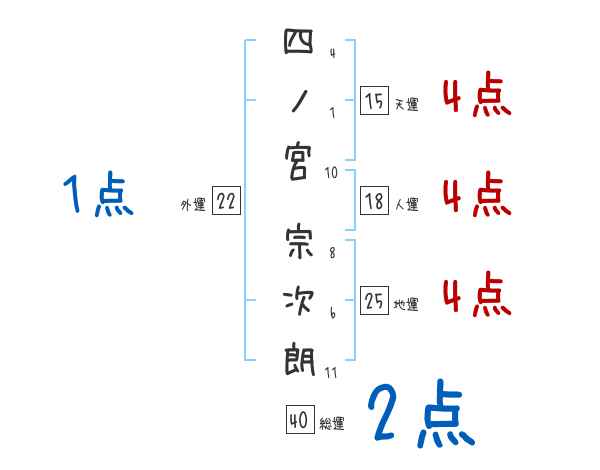 天運![]() | 四ノ宮宗次朗さんの天運は15画の4つ星!人徳があり出世する。順調に物事を進め円満な人生。 家系が持つ宿命的な運勢を表します。祖先から受け継いだ苗字ですので自分の力が及びません。家柄を象徴します。 |