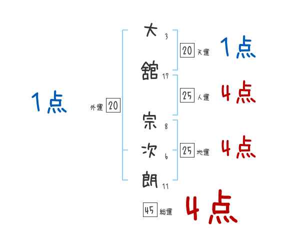 総運![]() | 大舘宗次朗さんの総運は45画の4つ星!もくもくと物事を進め達成する。地味な努力家。 あなたの人生を表す1番重要な運勢です。生涯を通じて影響する総合運となり、主に50歳以降の晩年期に影響を及ぼします。 |