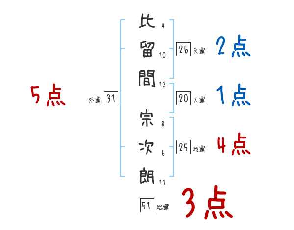 天運![]() | 比留間宗次朗さんの天運は26画の2つ星!波瀾万丈かも。信頼できる人を大事にしましょう。 家系が持つ宿命的な運勢を表します。祖先から受け継いだ苗字ですので自分の力が及びません。家柄を象徴します。 |