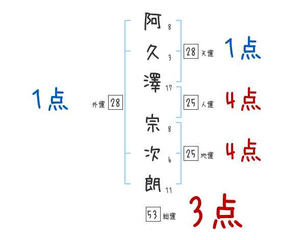天運![]() | 阿久澤宗次朗さんの天運は28画の1つ星!家庭環境に注意。スポーツで活躍できる能力があるかも。 家系が持つ宿命的な運勢を表します。祖先から受け継いだ苗字ですので自分の力が及びません。家柄を象徴します。 |