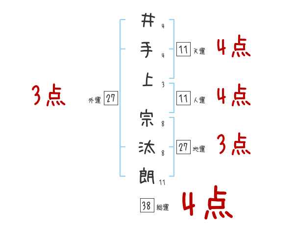天運![]() | 井手上宗汰朗さんの天運は11画の4つ星!着実に富や地位を得る幸運な人生。 家系が持つ宿命的な運勢を表します。祖先から受け継いだ苗字ですので自分の力が及びません。家柄を象徴します。 |