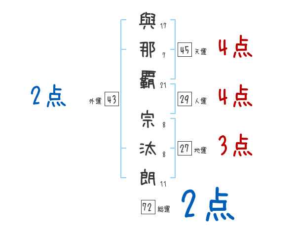 総運![]() | 與那覇宗汰朗さんの総運は72画の2つ星!災難が多く不安定な生活にならないように注意。明暗のある人生かも。 あなたの人生を表す1番重要な運勢です。生涯を通じて影響する総合運となり、主に50歳以降の晩年期に影響を及ぼします。 |