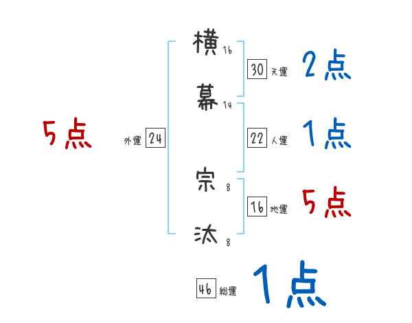 天運![]() | 横幕宗汰さんの天運は30画の2つ星!浮き沈みの激しさに注意しましょう。 家系が持つ宿命的な運勢を表します。祖先から受け継いだ苗字ですので自分の力が及びません。家柄を象徴します。 |