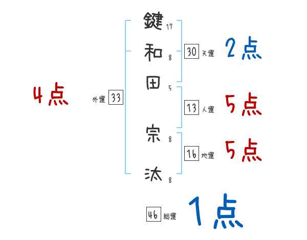 天運![]() | 鍵和田宗汰さんの天運は30画の2つ星!浮き沈みの激しさに注意しましょう。 家系が持つ宿命的な運勢を表します。祖先から受け継いだ苗字ですので自分の力が及びません。家柄を象徴します。 |