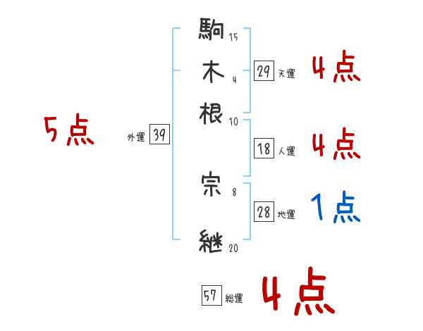 外運![]() | 駒木根宗継さんの外運は39画の5つ星!社交性に優れ人望が厚い。人の上に立ち成功する。 生活面を象徴する運勢です。外部から受ける影響力を表し、結婚運、家庭運や職場、環境への順応性を表します。 |
