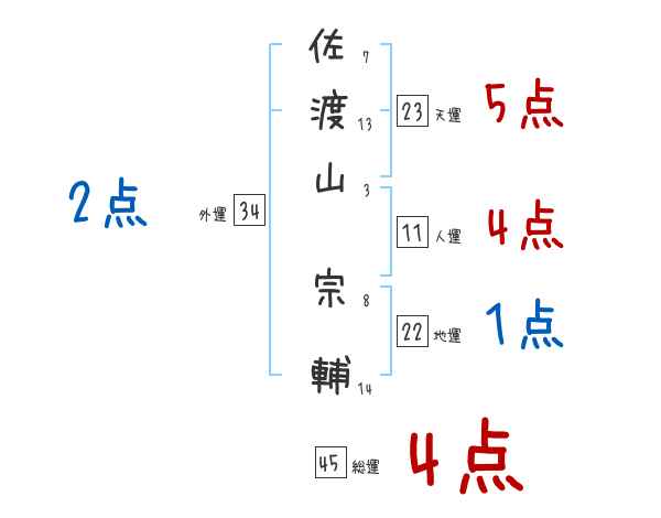 天運![]() | 佐渡山宗輔さんの天運は23画の5つ星!想像力に優れ活力がある。一代で成功し名誉を手に入れる。 家系が持つ宿命的な運勢を表します。祖先から受け継いだ苗字ですので自分の力が及びません。家柄を象徴します。 |
