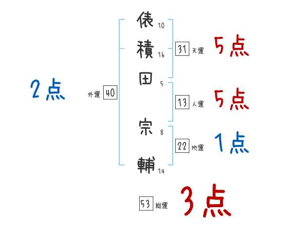総運![]() | 俵積田宗輔さんの総運は53画の3つ星!やや見栄っ張りで虚栄心がある。散財に注意。 あなたの人生を表す1番重要な運勢です。生涯を通じて影響する総合運となり、主に50歳以降の晩年期に影響を及ぼします。 |