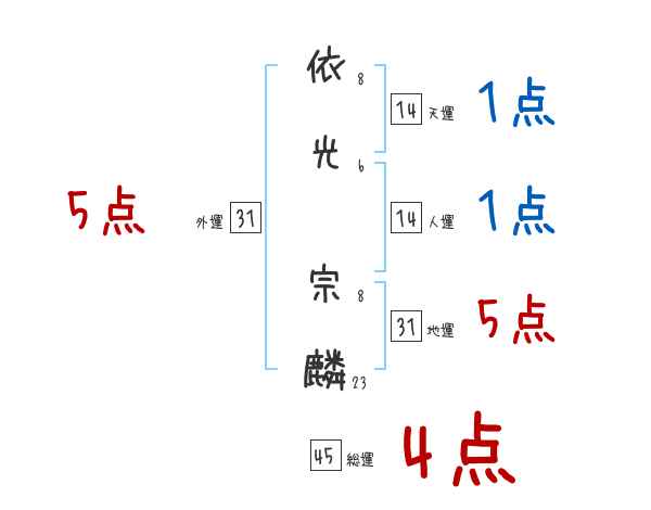 外運![]() | 依光宗麟さんの外運は31画の5つ星!社交性があり判断力に優れる。順風満帆な人生で円満な生活。 生活面を象徴する運勢です。外部から受ける影響力を表し、結婚運、家庭運や職場、環境への順応性を表します。 |
