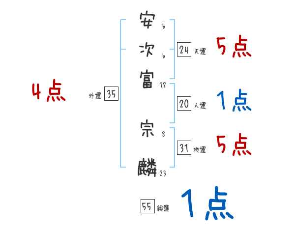 天運![]() | 安次富宗麟さんの天運は24画の5つ星!家庭運が良く順調な人生。金運にも恵まれる。 家系が持つ宿命的な運勢を表します。祖先から受け継いだ苗字ですので自分の力が及びません。家柄を象徴します。 |