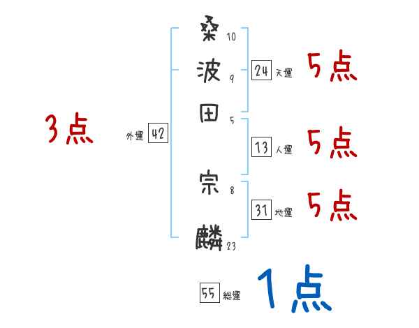 天運![]() | 桑波田宗麟さんの天運は24画の5つ星!家庭運が良く順調な人生。金運にも恵まれる。 家系が持つ宿命的な運勢を表します。祖先から受け継いだ苗字ですので自分の力が及びません。家柄を象徴します。 |