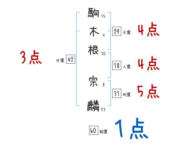 天運![]() | 駒木根宗麟さんの天運は29画の4つ星!完全主義で才能がある。厳格な心の持ち主。 家系が持つ宿命的な運勢を表します。祖先から受け継いだ苗字ですので自分の力が及びません。家柄を象徴します。 |