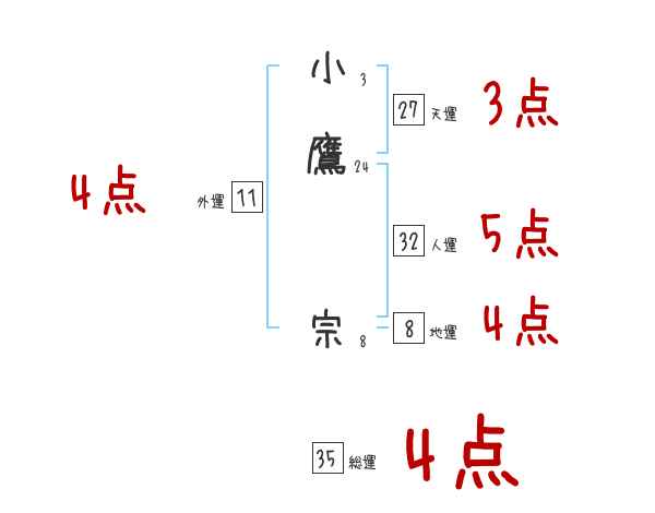 人運![]() | 小鷹宗さんの人運は32画の5つ星!柔軟性があり成功する。チャンスが多く金運が良い。 性格や才能などを表す2番目に重要な運勢です。人間関係や協調性、社会的な成功に影響します。主に20歳から50歳ぐらいまでの中年期の運勢を表します。 |
