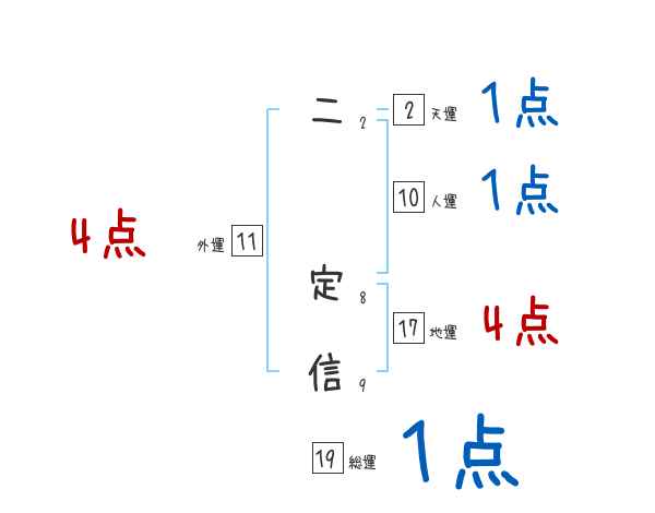 天運![]() | 二定信さんの天運は2画の1つ星!優しいですが積極性や意思の強さに欠ける傾向があります。家庭環境の乱れに注意しましょう。 家系が持つ宿命的な運勢を表します。祖先から受け継いだ苗字ですので自分の力が及びません。家柄を象徴します。 |