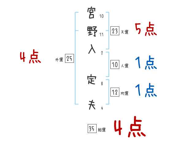 天運![]() | 宮野入定夫さんの天運は23画の5つ星!想像力に優れ活力がある。一代で成功し名誉を手に入れる。 家系が持つ宿命的な運勢を表します。祖先から受け継いだ苗字ですので自分の力が及びません。家柄を象徴します。 |
