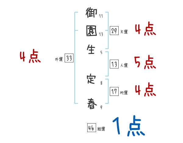 総運![]() | 御園生定春さんの総運は46画の1つ星!迷走することが多く苦労するかも。目先のことにとらわれないように。 あなたの人生を表す1番重要な運勢です。生涯を通じて影響する総合運となり、主に50歳以降の晩年期に影響を及ぼします。 |
