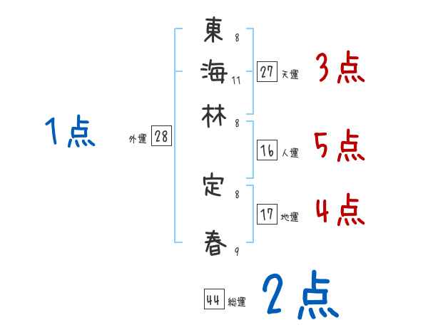人運![]() | 東海林定春さんの人運は16画の5つ星!人望が厚く大きく発展する。逆転成功が見える。 性格や才能などを表す2番目に重要な運勢です。人間関係や協調性、社会的な成功に影響します。主に20歳から50歳ぐらいまでの中年期の運勢を表します。 |