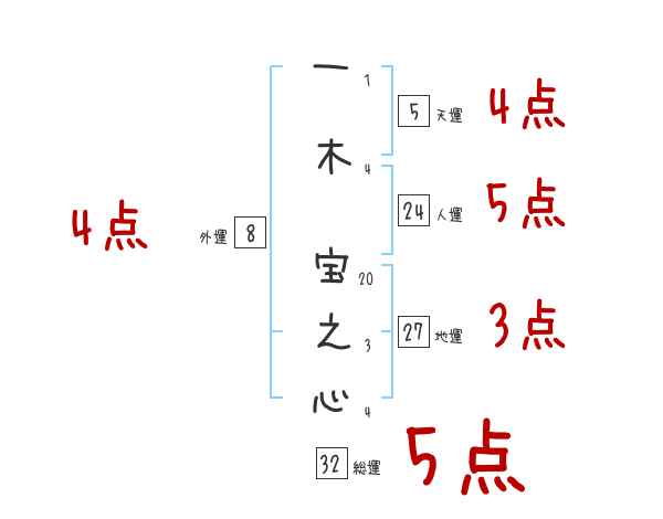 総運![]() | 一木宝之心さんの総運は32画の5つ星!柔軟性があり成功する。チャンスが多く金運が良い。 あなたの人生を表す1番重要な運勢です。生涯を通じて影響する総合運となり、主に50歳以降の晩年期に影響を及ぼします。 |