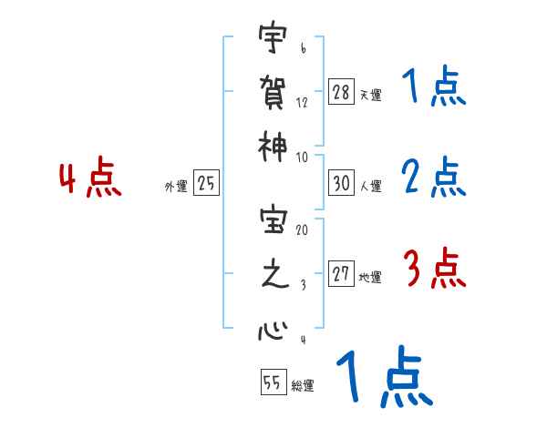 天運![]() | 宇賀神宝之心さんの天運は28画の1つ星!家庭環境に注意。スポーツで活躍できる能力があるかも。 家系が持つ宿命的な運勢を表します。祖先から受け継いだ苗字ですので自分の力が及びません。家柄を象徴します。 |